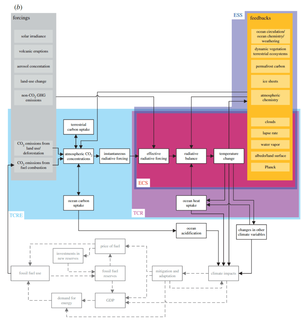 I guess it is not too misleading to call the 1970s the heyday of systems diagrams. Yet more influential texts, like Limits to Growth, also had a fair share of such. At this time, climate models were still not that complicated, but today they have caught up with the systems diagrams of yore. The figure below, from Knutti and Rugenstein, shows the dependencies of the modules of a contemporary global-circulation model—the type of model informing IPCC and decision-makers worldwide.