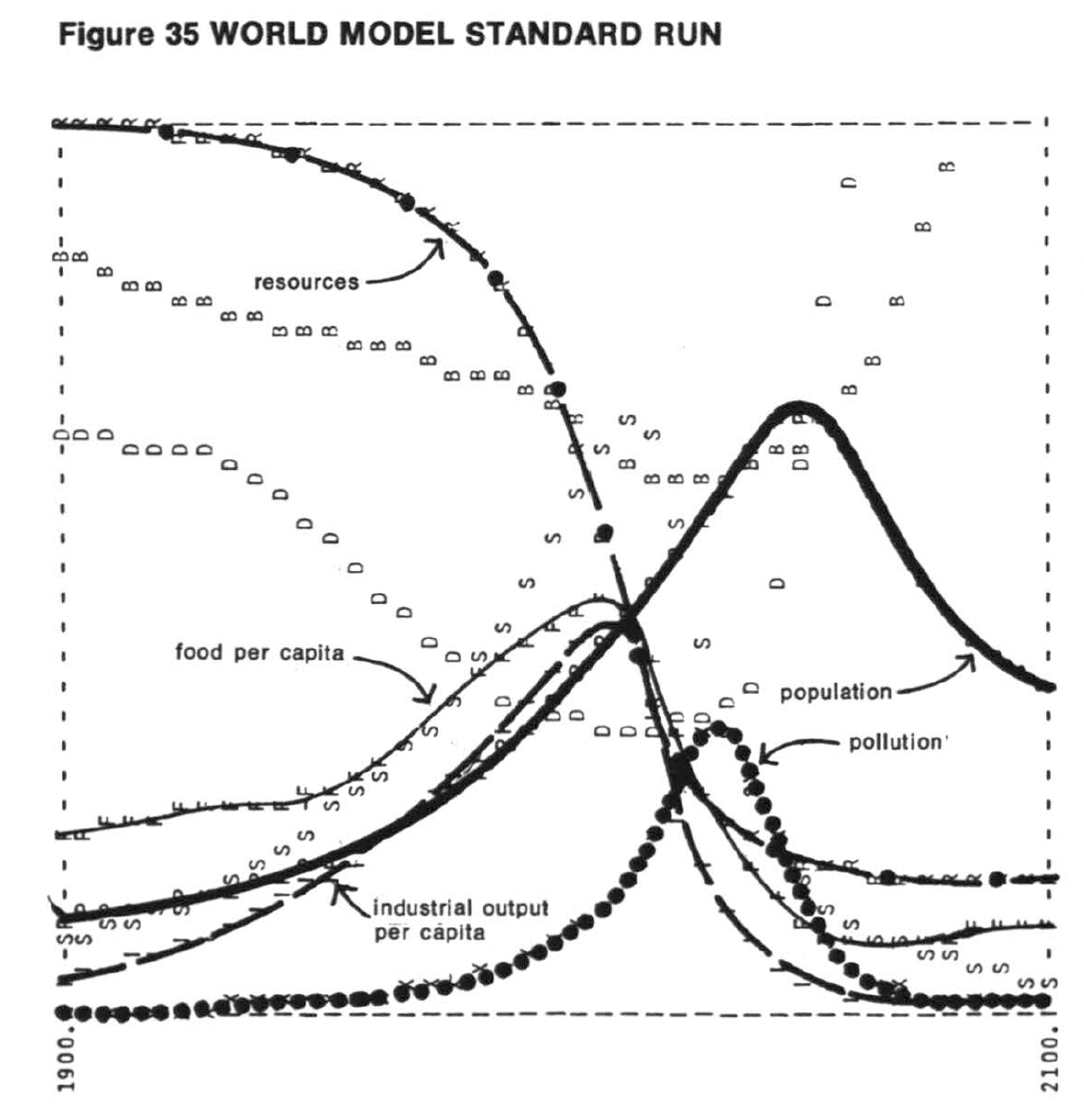 LTG was a report of a task force of scientists from MIT (Meadows, Meadows, Randers, Behrens) carrying out a project “on the predicament of mankind,” looking at humanity’s future to the end of the 21st century. It came out of a gathering of thinkers (a “non-organization”)—the Club of Rome, with roots in (surprisingly) the OECD and headed by the Italian industrialist Aurelio Peccei. Indeed, reading Peccei’s foresightful The Chasm Ahead (1969), one can’t help but wonder how other members contributed as it contains most of the precepts and conclusions of LTG (but, of course, no simulations). Peccei worried about the accelerating pace of civilization [3], the technological divide, the post-war political order, and, indeed, demographics, famine, and pollution.