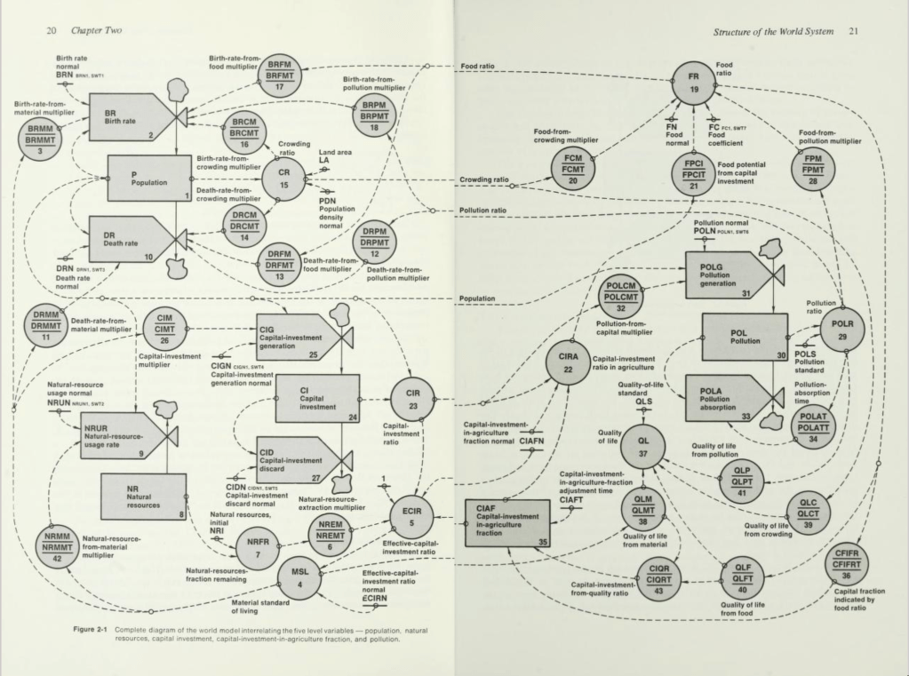 When the 1960s turned into the 70s, the accelerating growth of the Earth’s population was a significant public concern. In 1968, Stanford professor Paul Ehrlich’s The Population Bomb argued that, within a few decades, starvation would increase and eventually reach the middle class of the industrialized countries. Another concern in the budding environmentalist movement was environmental pollution by toxins like DDT. In this case, too, there was a momentously opinion-making book—Rachel Carson’s 1962 Silent Spring. Yet another worry was the flip sides of economic growth (cf. Mishan’s The Costs of Economic Growth). In addition to these sentiments—during these years amid the Apollo program—science’s esteem was soaring [2], including the young field of computer simulations of society. The stage was set for a work that could combine all these elements.