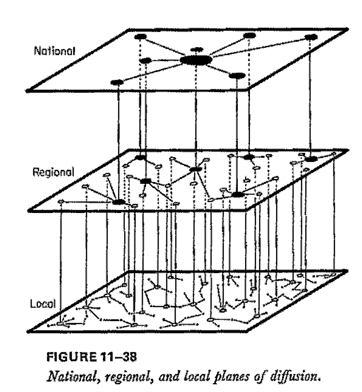 Although I have no training in geography, my fascination for the topic goes way back. My dad was an architect, and to escape the doldrums of Swedish suburbia, I occasionally leafed through his old textbooks. Spatial Organization by Abler, Adams, and Gould was a favorite. Especially the variety of illustrations fascinated me, and the fact that this was something considered valuable . . “it’s important for planning,” explained my father. For context, at least then, Swedes used to pride themselves in taking the middle way between market and planned economies. “Fair enough,” I thought, “the Swedish model needs economic geography.” But little did I know I would reach the same type of figures and thought myself much later, and from a very different direction.