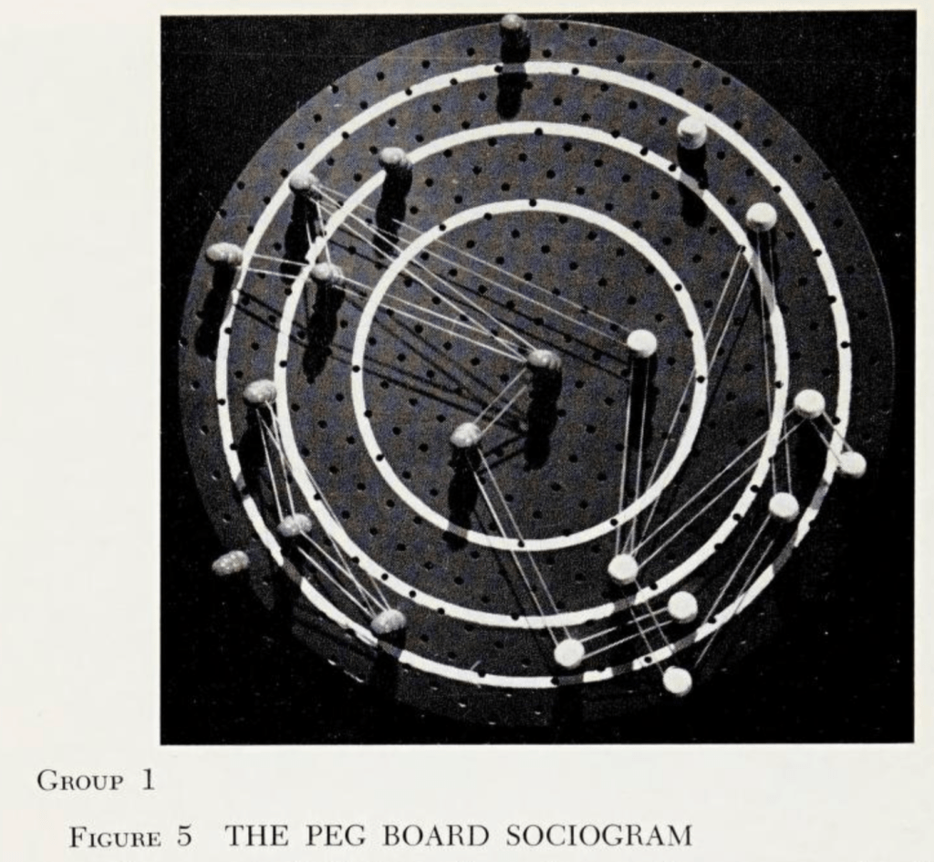 Mary L. Northway used the sociometry method developed by Helen Jennings and Jacob Moreno to study children’s social life. She wrote the very readable A Primer of Sociometry, with the interesting thesis that children can understand their context better if they see themselves in their social network (which could be visualized by a pegboard as follows):