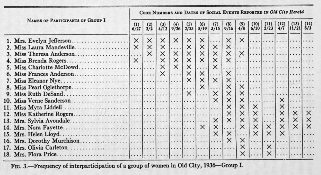 As it is conveniently small yet conspicuously structured, the literature on social network analysis often features the “Southern women” data. This data set came out of the structural anthropology research program at Harvard in the 1930s, headed by Lloyd Warner, and the fieldwork in Natchez, Mississippi, intended to paint a broad picture of social structures across social classes and the racial divide. The field workers were two married couples (one white, one black), and I assume Mary R Gardner did most of the collection of the southern women data since the nodes are white women. The other woman on the project, Elizabeth Davis, did not appear as an author on the most famous documentation of the project, Deep South. I just suppose it has something to do with the structural racism that was the topic of the study itself.