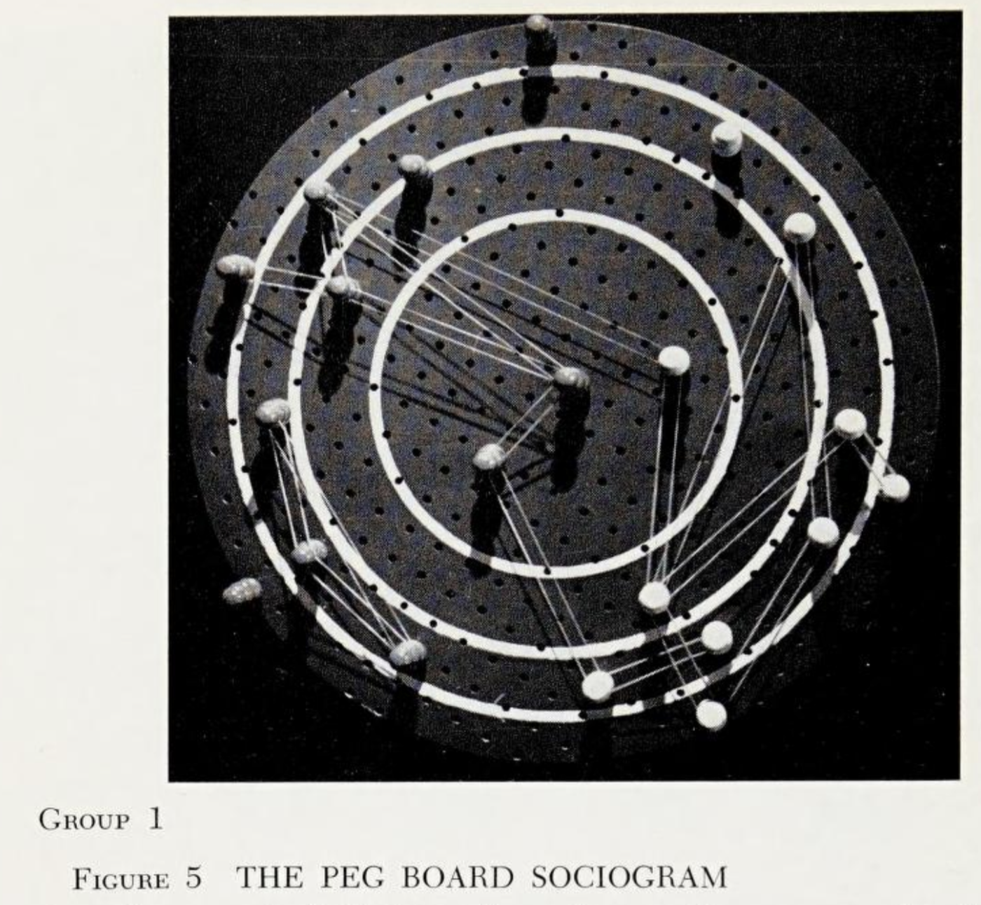 Mary L. Northway used the sociometry method developed by Helen Jennings and Jacob Moreno to study children’s social life. She wrote the very readable A Primer of Sociometry, with the interesting thesis that children can understand their context better if they see themselves in their social network (which could be visualized by a pegboard as follows):