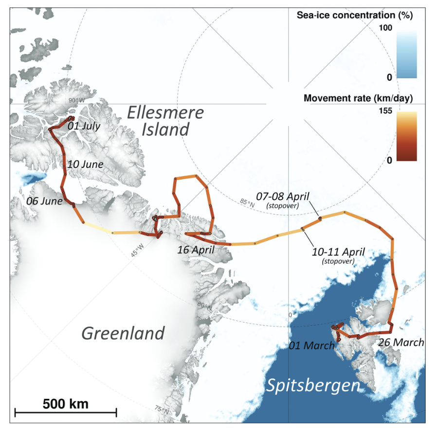 A paper about a female fox’s lonely 3506 km journey across the high Arctic—from Svalbard to Ellesmere Island. I’ve always had a soft spot for barren, hostile places and their tough inhabitants. A disappointment is that the paper never really rationalized the trip. Why did she start it? What forks in the paths of her life led her all the way to Canada? We also learn that her human counterpart (*), Fridtjof Nansen, was shocked to spot arctic foxes 85 degrees north.